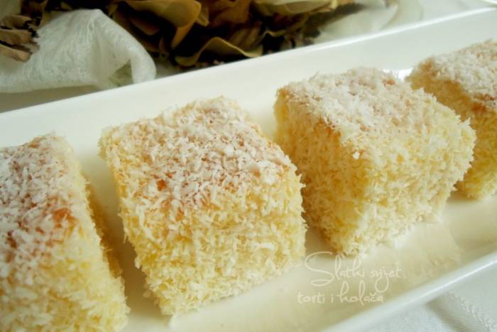 Kockice biskvita umačite u rastopljenu čokoladu i uvaljajte u kokosovo brašno.