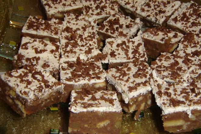 Kekse prepoloviti, a orahe nasjeckati pa sve skupa dodati u čokoladnu smjesu, promiješati i izliti u kalup namazan maslacem ili margarinom.