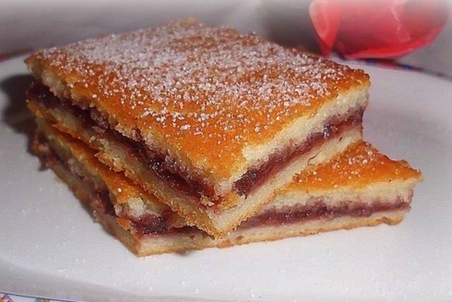 Onda izvadite iz pećnice, premažite pekmezom, pospite šećerom, pa naspite ostatak smjese.