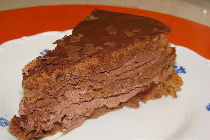 - Otopiti čokoladu, dodati maslac i kakao, malo pustiti da se ohladi. Potom umiješati smjesu žumanjaka i šećera. Polako dodavati prosijano brašno s praškom za pecivo, mljevene lješnjake, te ruma toliko da smjesa ne bude pregusta.