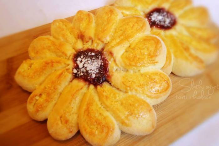 Peciva složite na lim za pečenje obložen masnim papirom i ostavite da miruju pola sata na toplome mjestu. Prije pečenja peciva pomoću kista premažite s razmućenim jajetom, a u sredinu svakog cvijeta stavite malo pekmeza i posipajte s malo sezamovih sjemenki ili mrvljenom kockom šećera. Peciva pecite 20-25 minuta na temperaturi od 180 °C.