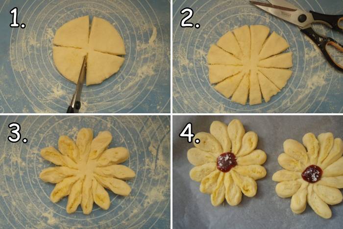 U svaki krug stavite malo nadjeva pa rubove tijesta spojite u sredinu. Pritisnite tijesto prstima da se dobro slijepi. Krug od tijesta ponovo spljoštite i lagano razvaljajte. Tijesto razrežite dvanaest puta pa svaki izrezani kraj preokrenite tako da dobijete oblik latice.
