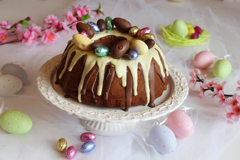 Jednostavana ideja za dekorativan uskrsni kolač! Isprobajte ukusan kuglof od griza i malina preliven mliječnom i bijelom čokoladom!