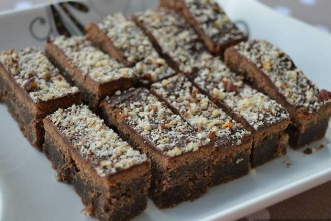 Preliti malo prohlađen biskvit ovom glazurom, posuti mljevenim lješnjacima, ostaviti da se ohladi i rezati na tanje štangice.