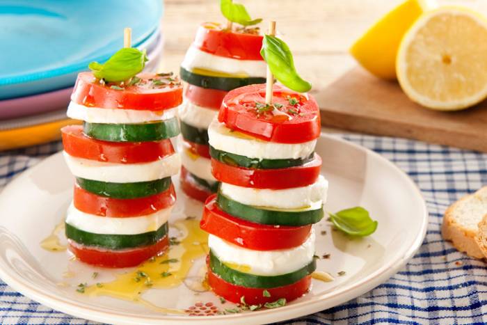 - Slažite tornjiće tako da krenete od ploške rajčice, zatim stavite plošku mozzarelle i na nju plošku krastavca. Ponovite još jedanput. Završite tornjić ploškom rajčice.