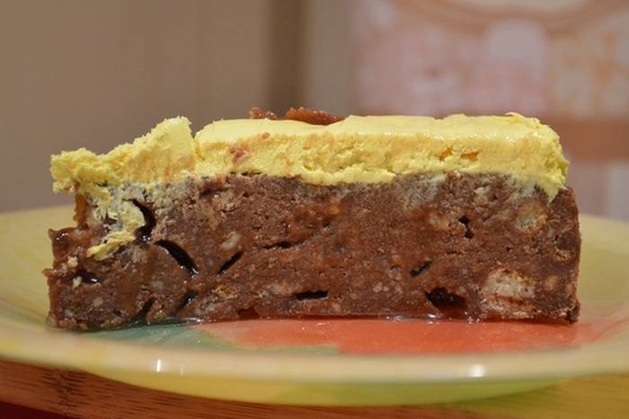 - Smjesu od keksa prelijte mlijekom i isopljenim margarinom, zatim umijesite, stavite u kalup za tortu (prethodno obložen papirom za pečenje) i ostavite u frižider da se stvrdne.