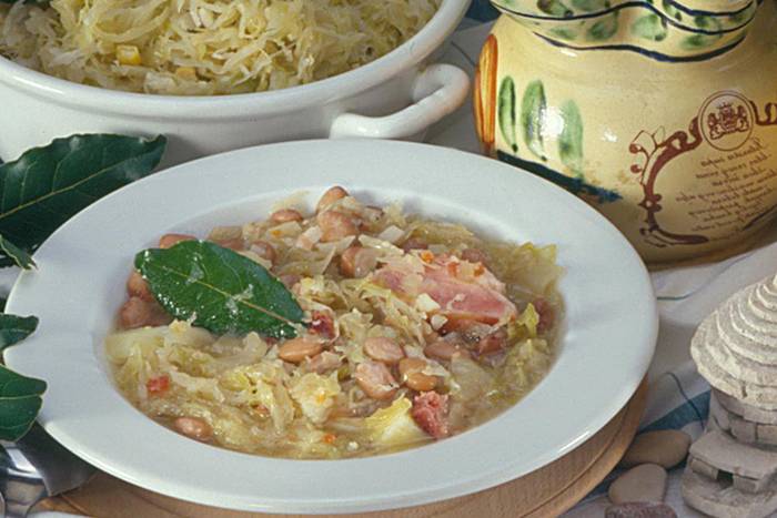 Kada grah napola omekša, dodajte ga zajedno s tekućinom kupusu. Dodajte još lovorov list, papar, sol i zajedno nasjeckanu slaninu i češnjak.