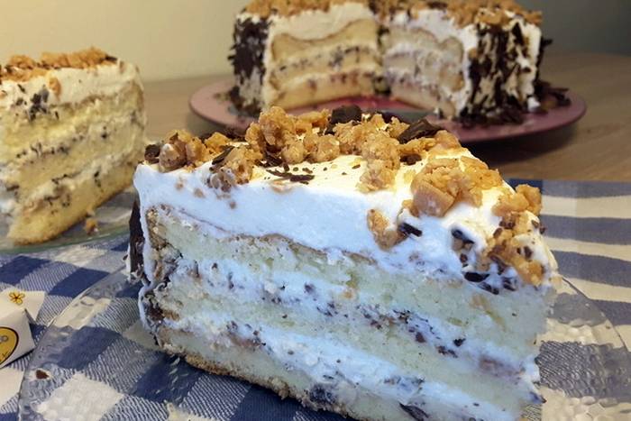 Na podlogu staviti obruč kalupa za tortu, pa u njega staviti prvu koru. Koru namazati kremom od mliječnog namaza, zatim posuti komadiće karamela i čokolade, a preko toga namazati šlag kremu. Nakon toga druga kora, pa ponoviti postupak s kremama, čokoladom i karamelama. Nakon toga dođe treća kora koja se premazuje samo šlag kremom, a zatim se ukrasi ostatkom karamela i čokolade.