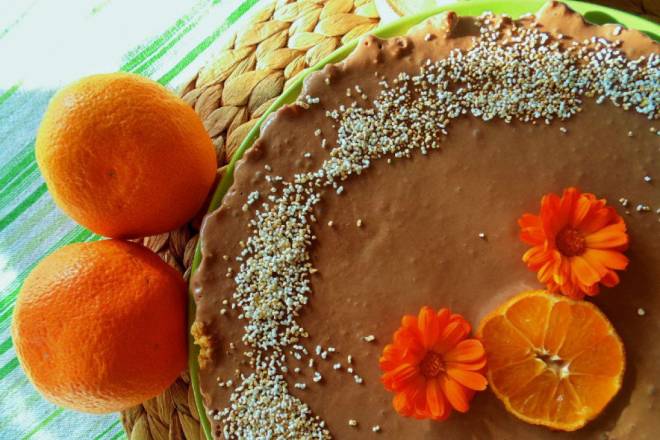 4. Kolač ukrasite po želji. Suzana ga je ukrasila amarant pahuljicama, jestivim cvijećem nevena i mandarinom.