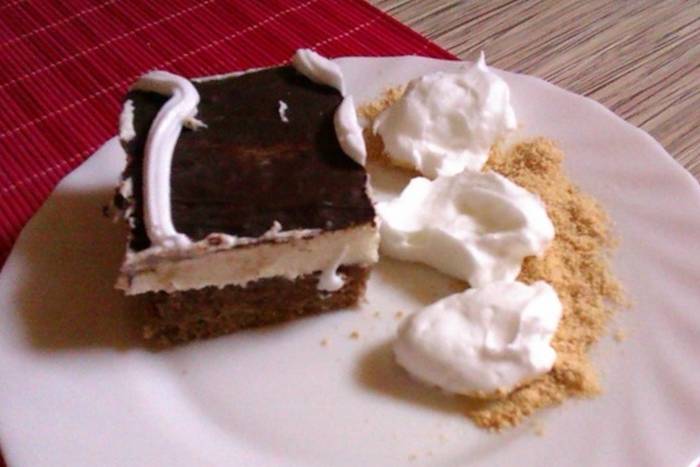 Kora: Pjenasto umutiti jaja sa šećerom, pa lagano dodavati brašno i kakao, sve lijepo sjediniti i izliti u podmazan pleh.