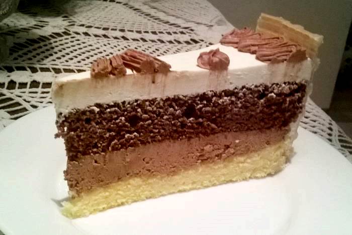 1. Ispeći tamni i svijetli biskvit na sljedeći način: razdvojiti bjelanje od žutanjaka. Umutiti bjelanke u snijeg s prstohvatom soli. Mutiti žumanjke postupno dodajući šećer, vanilin šećer, ulje, vodu i prosijano brašno i prašak za pecivo. U smjesu lagano žlicom umiješati pjenu od bjelanjaka.