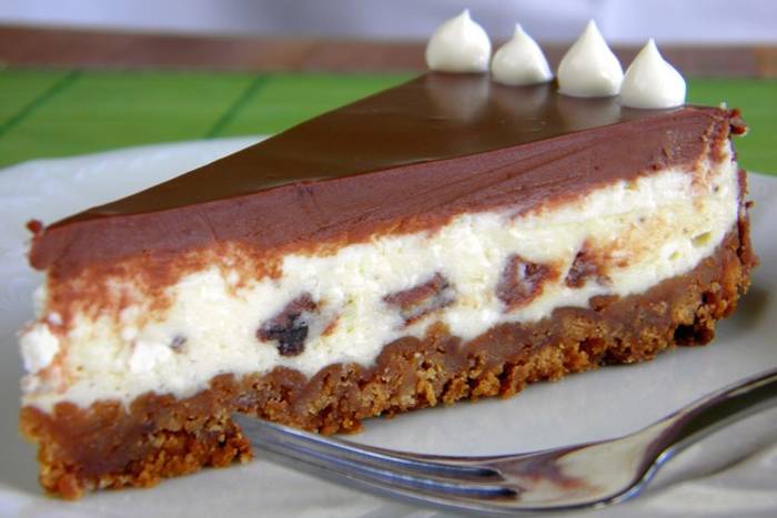 - Za kremu miksati sir par minuta, dodati šećer. Umiksati u kremu jedno po jedno jaje i na kraju žlicu gustina. Na kraju kuhačom umiješati sitno sjeckanu Milku.