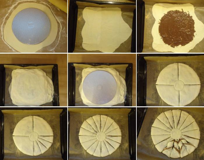 Razvaljano tijesto lagano prisnite tanjurom kako bi označili rub do kuda ćete namazati Nutellu. Premjestite ga na veliki lim za pečenje prekriven masnim papirom i premažite nutellom.