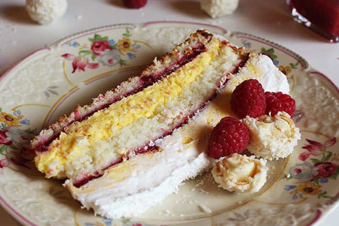 Kremasta kokos torta s vanilijom, bijelom čokoladom, komadićima Raffaello kuglica i malinama!