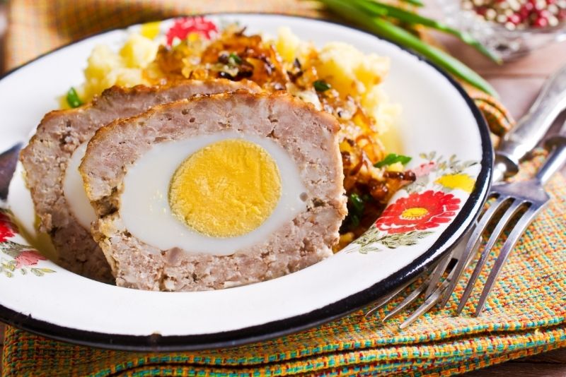 Taj kalup za pečenje premažite uljem i pospite krušnim mrvicama. Zatim u njega stavite malo više od polovine smjese, po sredini utisnite tvrdo kuhana jaja, pa preko njih stavite ostatak smjese. Malo prizisnite ruka, oblikujte, površinu poprskajte uljem i pospite krušnim mrvicama, a zatim roladu iz kalupa istresite u nauljen lim, u kojem ćete je peći.