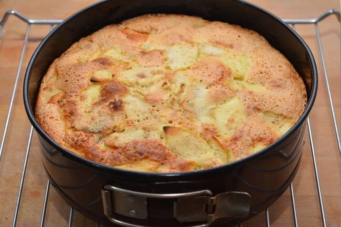 Kad je kolač gotov ostavite ga u kalupu desetak minuta, a potom ga okrenite na tanjur za posluživanje tako da jabuke budu na vrhu.