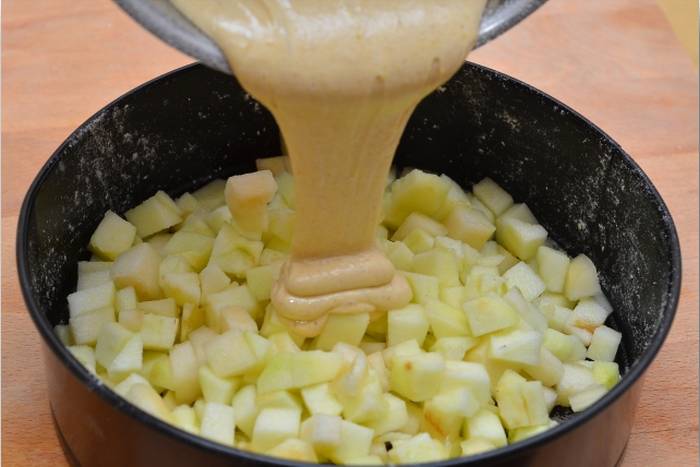 Jabuke ogulite, očistite od sjemenki, izrežite na kockice srednje veličine i poslažite ih direktno u pripremljen kalup za pečenje (promjera cca 22 cm).
