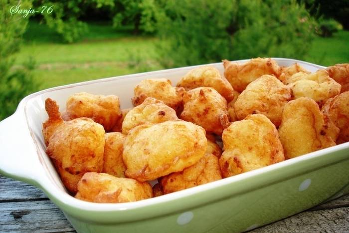 Zagrijte u manjem loncu ulje. Kad se ulje dobro zagrijalo malo smanjite temperaturu. Umočite veliku žlicu u dobro zagrijano ulje pa uzimajte oko pola dobre žlice tijesta. Spustite u vrelo ulje, uštipak će spasti sa žlice na dno pa će isplivati.